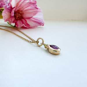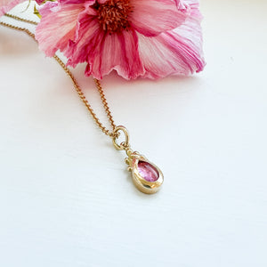 Dette vedhæng er lavet i 18kt guld, med en virkelig flot dråbeformet lyserød tourmaline, slebet i cabochon slib, dvs at den har en flad bund, og en buttet rund top, som bare passer så godt til dråbeformen.